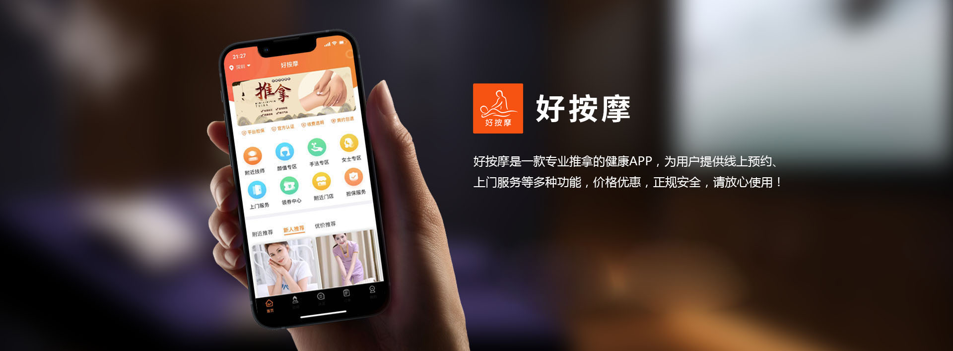 好按摩是一款专业推拿的健康APP,为用户提供线上预约上门服务等多种功能,价格优惠,正规安全,请放心使用! 请点击下方下载,也可前往各个应用商店下载!